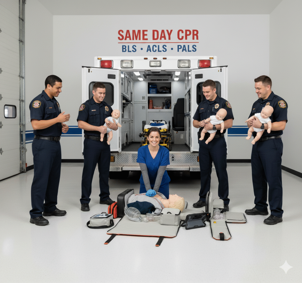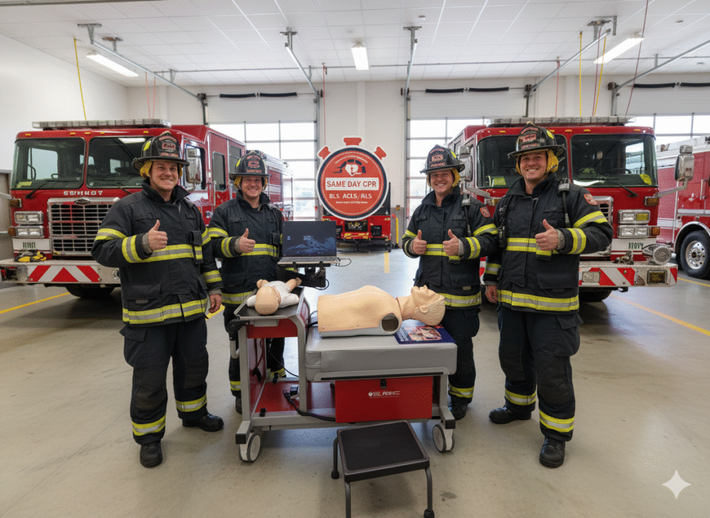 Same Day CPR provides a simple and affordable solution for fire departments of all sizes to train their staff. With an American Heart Association Self-Guided Station, your team can complete Basic Life Support (BLS), Advanced Cardiovascular Life Support (ACLS), or Pediatric Advanced Life Support (PALS) training anytime it fits their schedule.