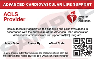 AHA Advanced Cardiovascular Life Support (ACLS) is for healthcare professionals caring for critically ill patients. Topics include heart rhythm recognition, advanced airway management, emergency medications, and resuscitation team leadership. Students complete online modules and practice skills at our Self Guided AHA Station before earning certification.